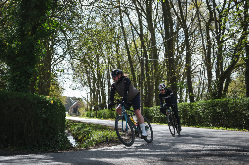 Na een kilometer of 10 met de wind in de rug en Vlaams vlak naar beneden aangekomen bij de start waar we zo door konden rijden en het avontuur begon. Het leek wel een race, uit elke bocht werd weggesprint en als snel besloot ik verstandig te doen. Dat sprinten, dat is niet mijn ding en doe ik het te vaak dan brand ik mezelf helemaal op. Na enige kilometers dus in m’n eigen ritme gekomen en voor ik het wist reed ik de eerste kasseien klim op en ging ik de poort in Ieper door..